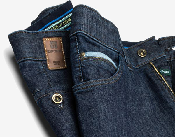 Bequeme Flat Front-Hose mit elastischem Komfortbund und Hemdstopper. Gefertigt aus einem robusten Stretch-Ring-Denim. Gewicht: 500 g/lfm Dieses Modell verfügt über eine normale Leibhöhe und ein gerades Bein.